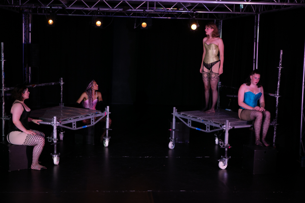 Benedikt Buchecker greift mit seiner Inszenierung diese Gesellschaftskritik auf und erweitert sie geschickt. Lysistrata wird bei ihm zum Vexierspiel zwischen dem Damals und den, scheinbar emanzipierten, Gegebenheiten heute. Denn auch im Hier und Jetzt müssen wir uns weiterhin unbequeme Fragen stellen, zu den Rollen, die Frauen in unserer Zeit einnehmen (dürfen) und ob, auch angesichts der realen Gewalt, der sich Frauen immer noch ausgesetzt sehen, der Kampf der Geschlechter wirklich schon ausgetragen ist, oder es eine weitere Runde braucht, um ihn und unser selbstzerstörerisches Streben nach Macht ein für allemal zu begraben.